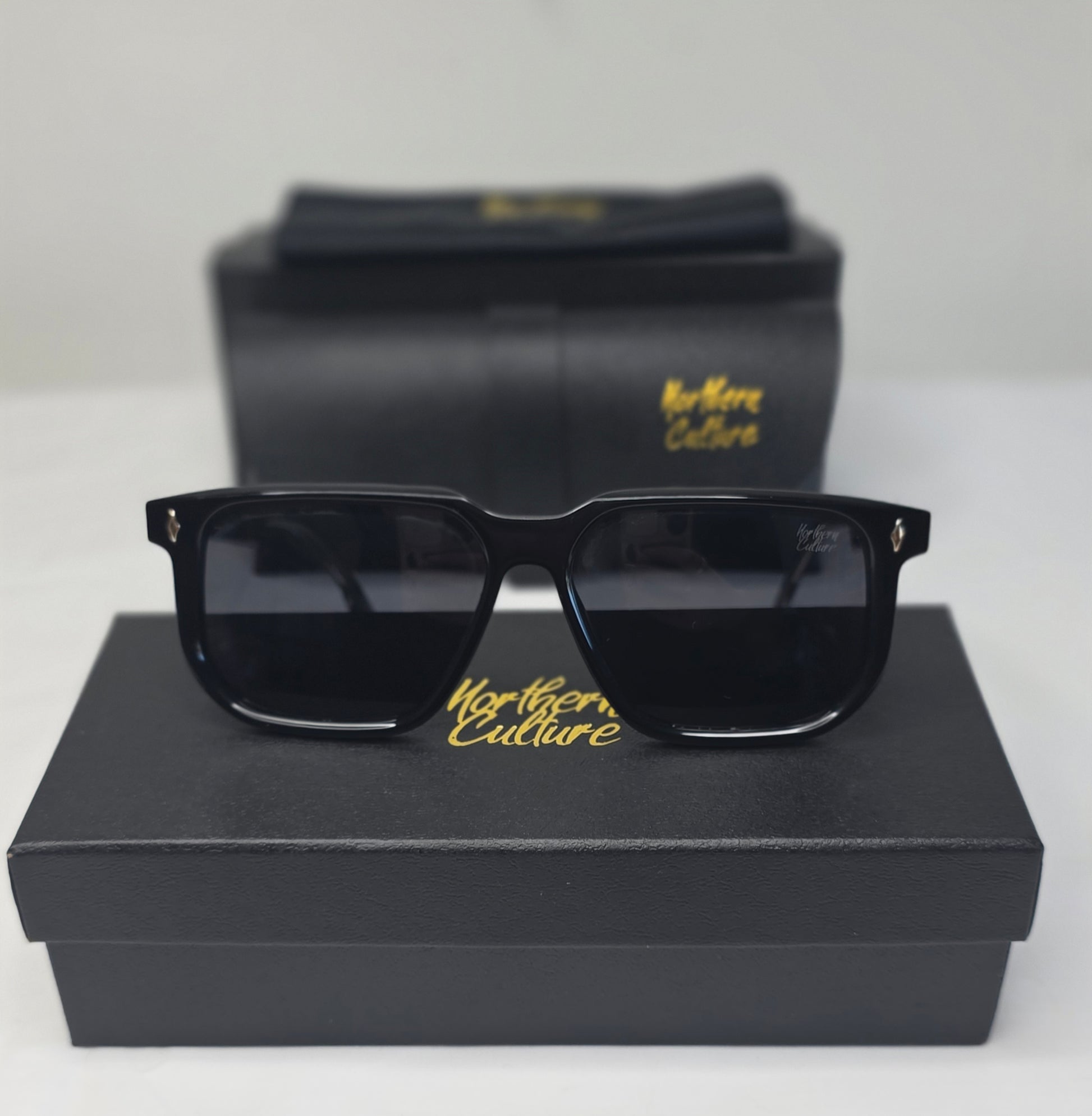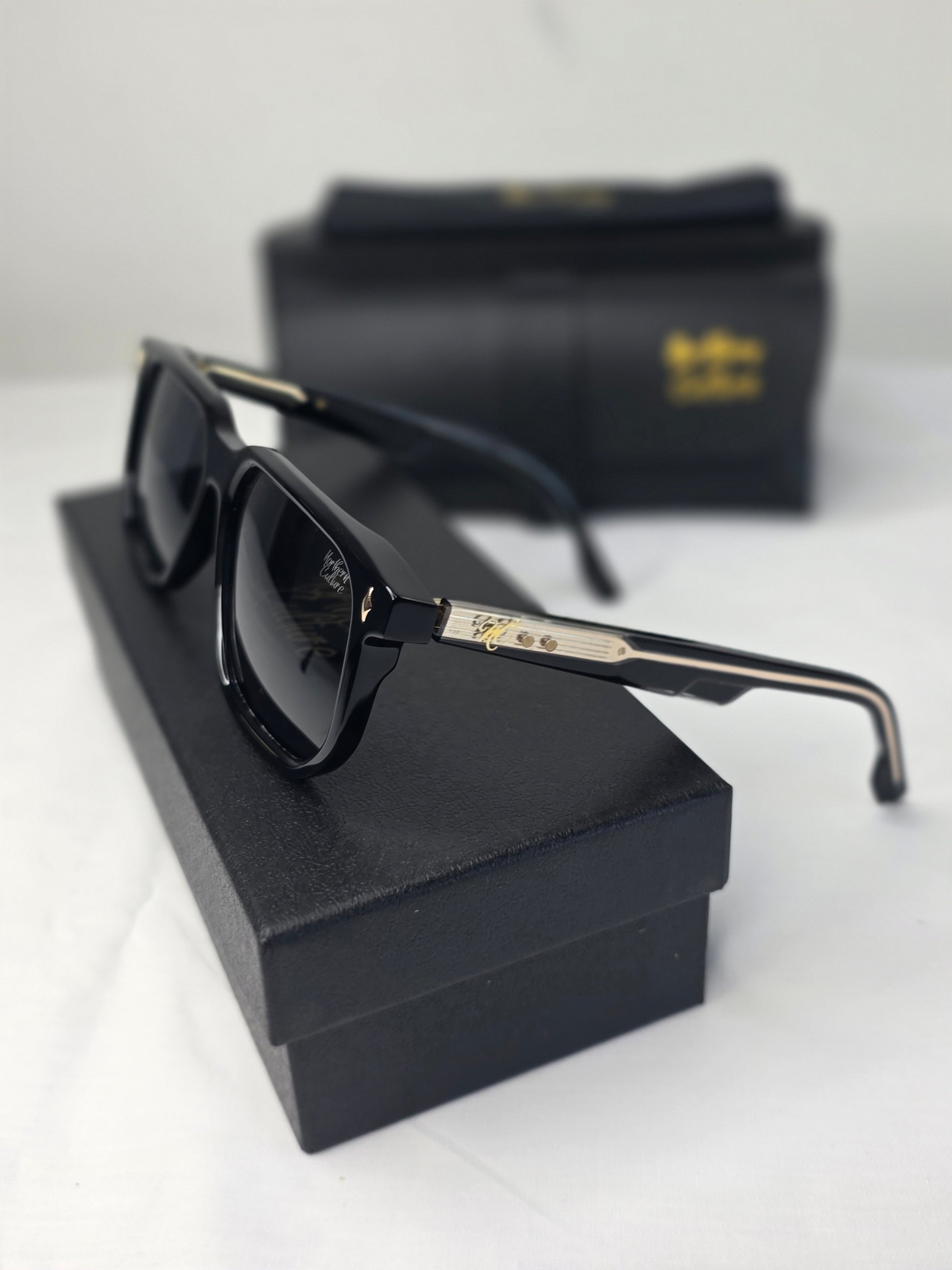 Polarised Acetate Black Frame with Gold Detailing on each arm with NC logo